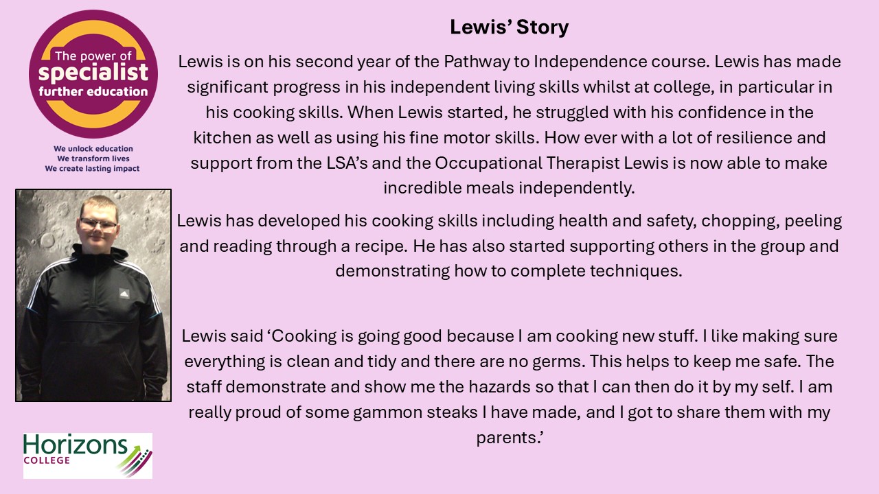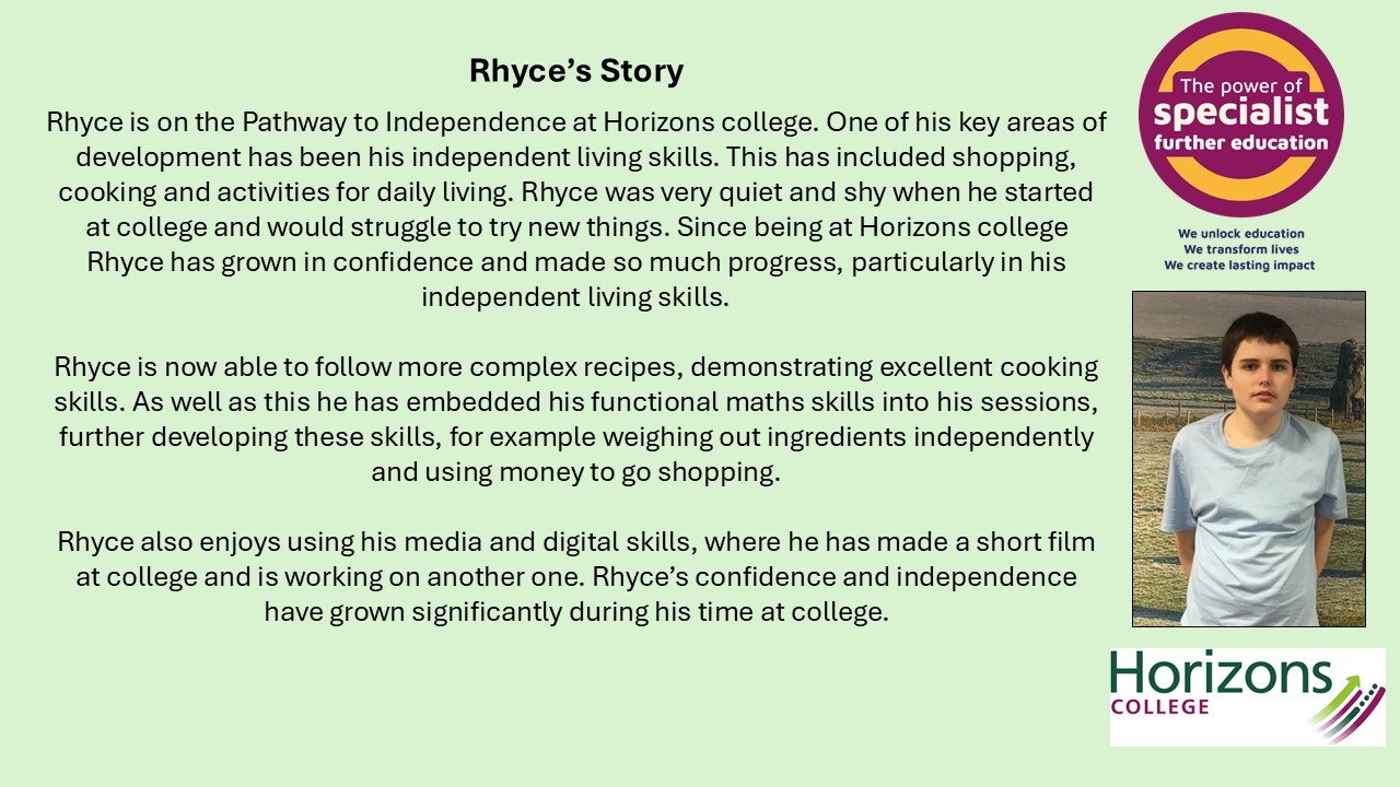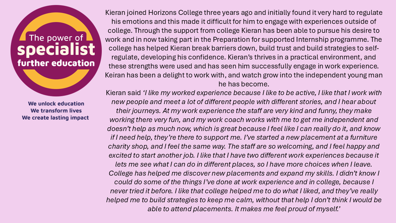 In support of NATSPEC and their Power of Specialist Further Education campaign, Horizons College have been sharing some of their learner success stories. It is fantastic to see so many of our young people achieving so much. We would like to share some of these stories with you below. To read more, please follow the link to the Horizons College website